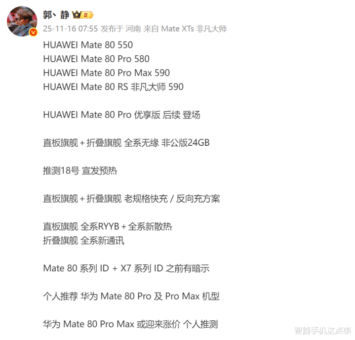 关于售价,目前尚无确切消息,但博主推测Mate80 Pro Max可能会迎来涨价,不过整体价格区间预计会与上一代保持相近水平。
